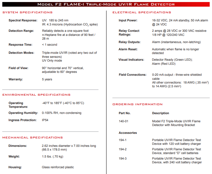 Model F2 FLAME-i là một đầu báo lửa có tính linh hoạt cao. Thiết bị này cung cấp hai chế độ hoạt động và người dùng có thể thiết lập tùy theo nhu cầu sử dụng: Chế độ UV/IR ba chế độ hoặc Chế độ chỉ UV. Thiết bị cũng cung cấp hai cài đặt độ nhạy, cao và thấp, cho nhiều ứng dụng khác nhau. Thiết bị dò được tích hợp rơle tiếp điểm để điều khiển hoặc tắt thiết bị. Vỏ được làm từ vật liệu nhựa gia cường sợi thủy tinh với độ cứng tuyệt vời và thân thiện với môi trường. Thiết bị dò sử dụng thấu kính sapphire chuyên dụng cao cấp cho phép truyền bức xạ UV và IR đến các cảm biến và cung cấp trường nhìn có thể điều chỉnh.